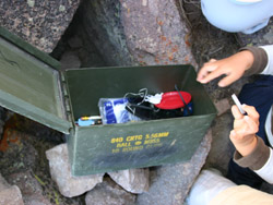 無事探し当てたら、容器に 入ったログブックにサインし、帰宅後、そのキャッシュのページでオンラインでもログを書きます。このログは各キャッシュの ページに公開されるとともに、キャッシュの設置者(オーナー)にメールで知らされ、オーナーは自分の設置したキャッシュやその場所を他のプレイヤーがどの ように楽しんだかの報告を受けることができます。
